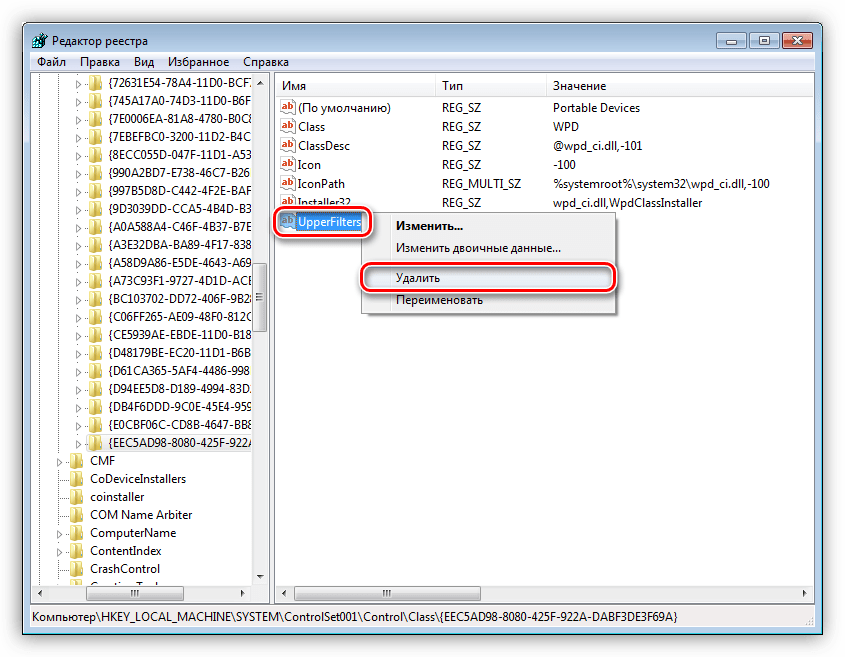 В найденном разделе, в правом блоке, удаляем параметр с названием «UpperFilters» (ПКМ – «Удалить»).