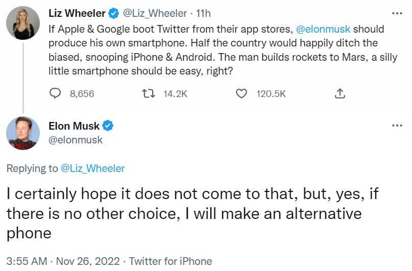 A podcaster named Liz Wheeler tweeted regarding Twitter being removed from the App Store & Google Play store. She mentioned that Elon Musk should make his own phone if that happens. Since Elon has an excellent reputation, she believes people will abandon Google and Apple and move to Elon’s phone instead. She also speculates that making a smartphone won’t be too hard for someone who builds refuellable rockets.