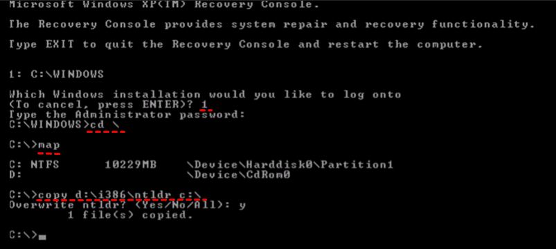 Step 4. Input Y to overwrite the corrupted or compressed NTLDR file.