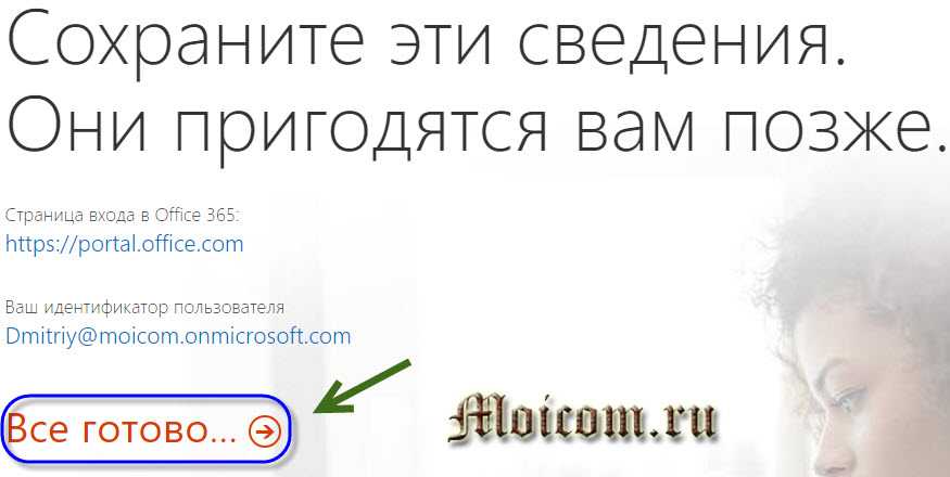 Сохраните эти данные, они понадобятся вам позднее: страница входа в Office 365 и ваш идентификатор пользователя. Для продолжения нажмите Все готово.