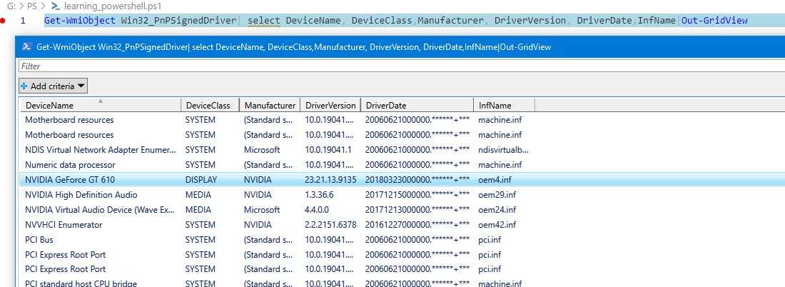 В нашем примере мы получили таблицу Out-GridView со списком драйверов в репозитории Windows в формате: имя устройства, класс устройства, производитель, версия драйвера, дата установки, имя inf файла драйвера (oemXXX.inf).