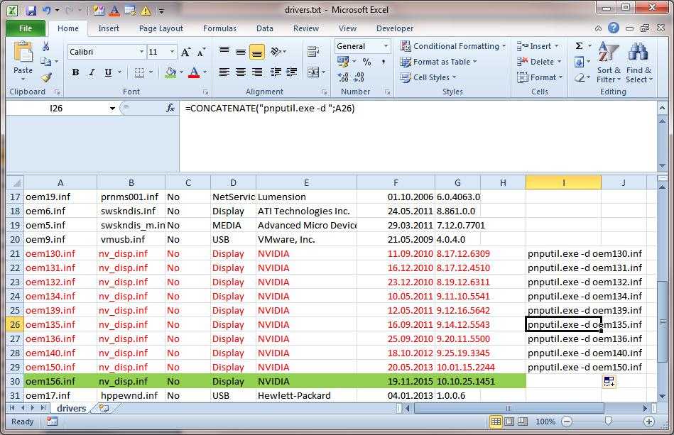 Удалите все лишние данные в таблице и оставьте только столбцы: файл драйвера в системе (oemXXX.inf), имя оригинального inf файла, класс устройства, производителя, даты установки и версии драйвера. Отсортируйте таблицу по столбцам B (содержит имя оригинального inf файл) и столбцу F (дата установки драйвера). Среди групп одноименных драйверов отметьте для удаления все версии драйверов, кроме последней. В моем случае видно, что большинство старых версий драйверов принадлежит NVIDIA.