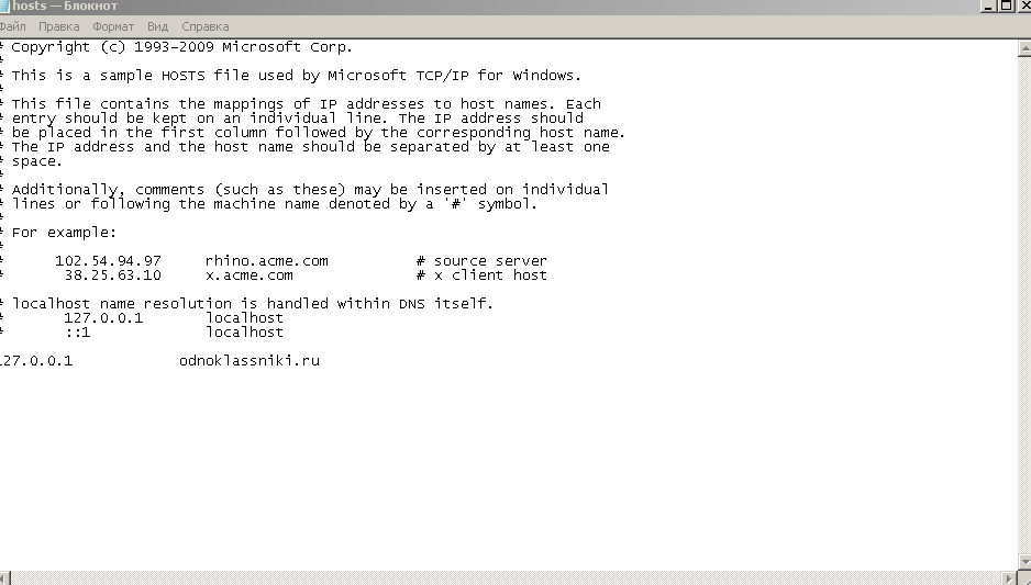 и посмотрите, есть ли здесь строка с названием социальной сети. Если есть – удалите эту строку и сохраните изменения. После чего можно спокойно открывать ОК. Не забывайте, что работа с системными файлами может осуществляться только с правами администратора