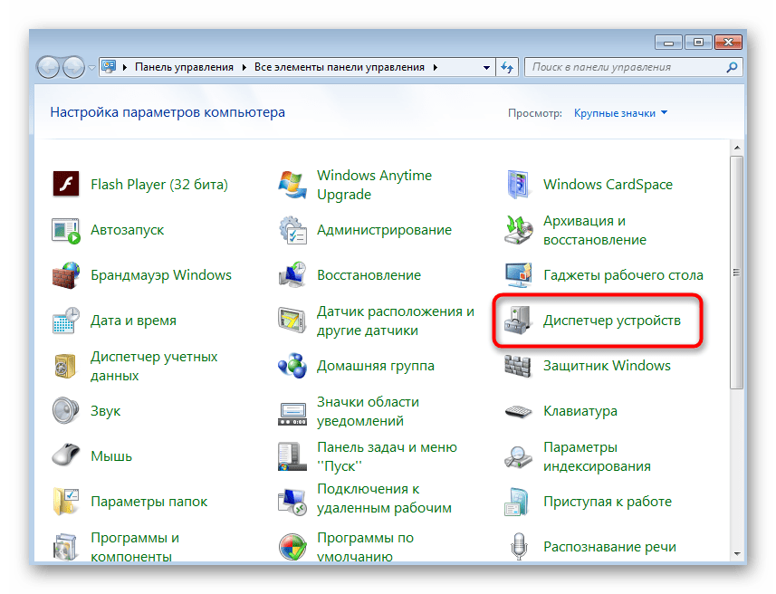 В списке отыщите «Диспетчер устройств» и кликните по этой строке левой кнопкой мыши.