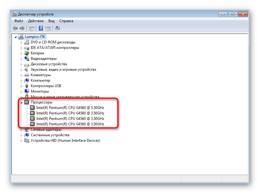 Например, на приведенном далее скриншоте отображается сам процессор с разделением на каждое доступное ядро. Там же выводится и его максимальная герцовка.