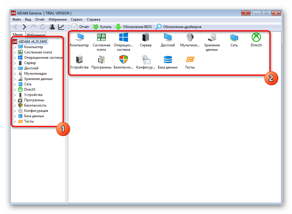 - Воспользуйтесь ссылкой выше, чтобы загрузить AIDA64 с официального сайта и установить на свой ПК. После запуска вы увидите распределение на категории. Откройте одну и них, отталкиваясь от интересующего комплектующего.