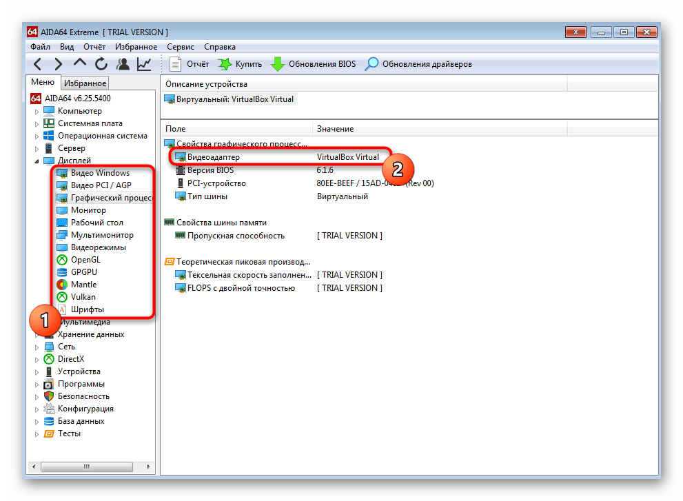 Все категории разделены на подкатегории, где расположены тематические сведения. Перемещайтесь между ними, чтобы просматривать информацию. Например, в разделе «Графический процессор» вы найдете наименование используемой видеокарты, версию ее BIOS, тип шины и узнаете пропускную способность.