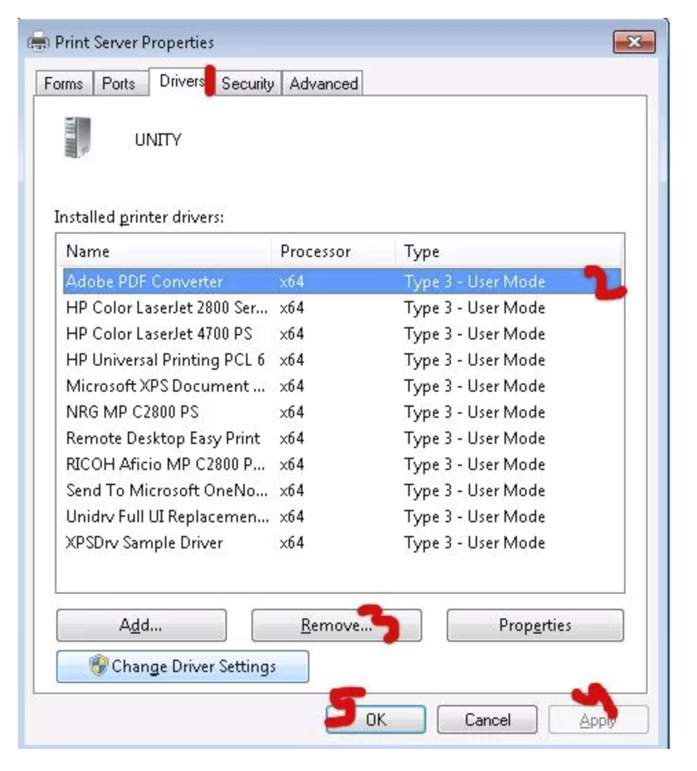 Step 7: Choose the Drivers tab, then click to highlight the driver for the old printer and click on the Remove button for each of the drivers found.