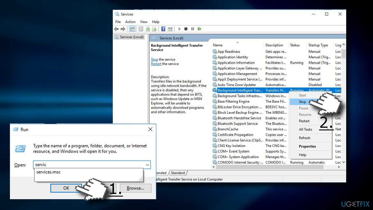 - Find Background Intelligent Transfer Service, right-click on it, and select Stop.