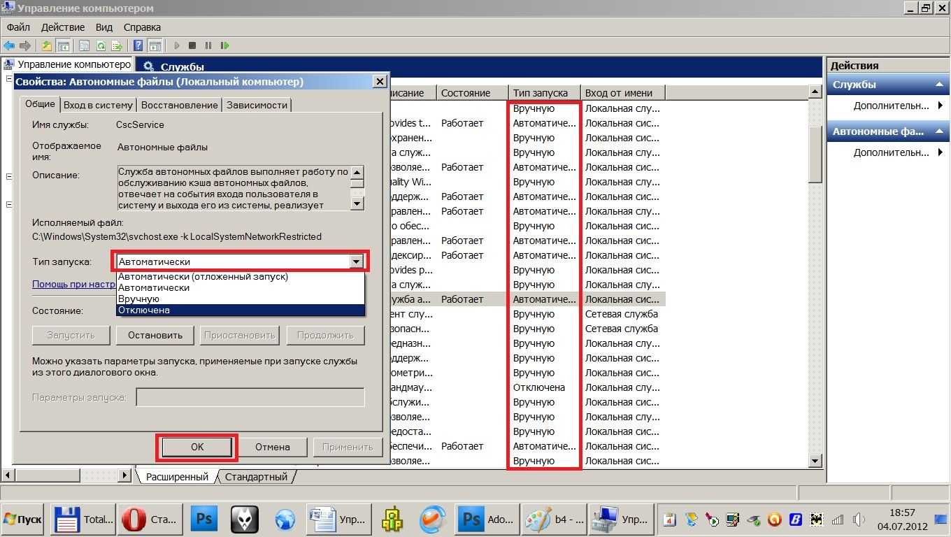 Когда необходимые службы стали известны, пробуем включить их. Если тип запуска по умолчанию неизвестен — пробуем «Автоматически» с последующей перезагрузкой компьютера.