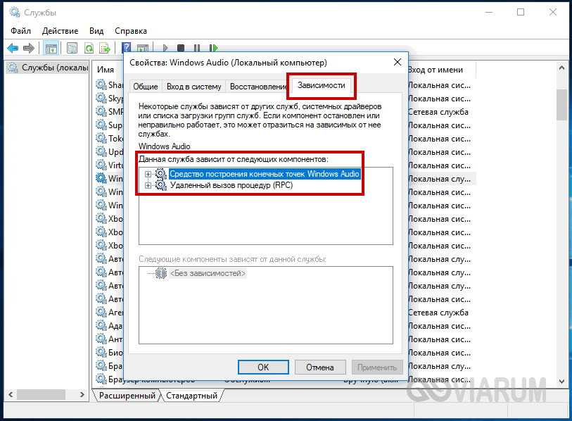 В вкладке «Зависимости» не отображаются такие пункты как «Plug and Play» и «Питание», но высока вероятности, что они являются необходимыми для работы службы.