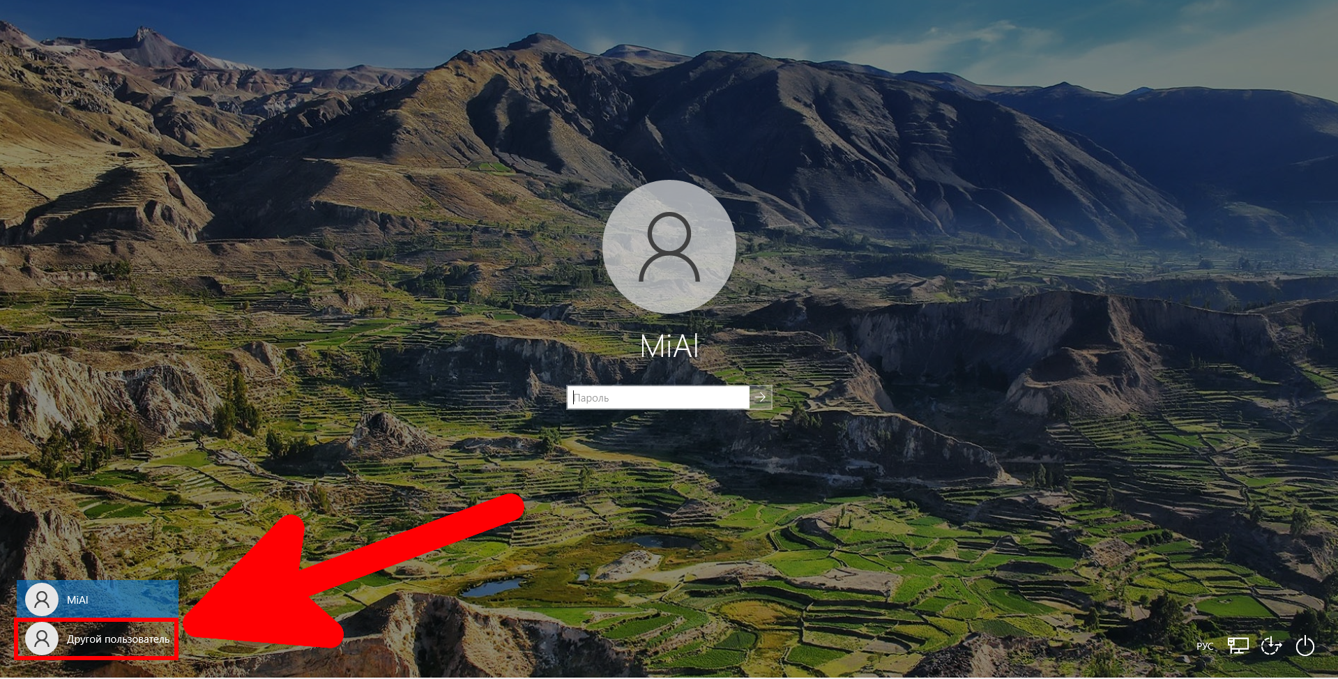 При включении компьютера нажмите «Другой пользователь».