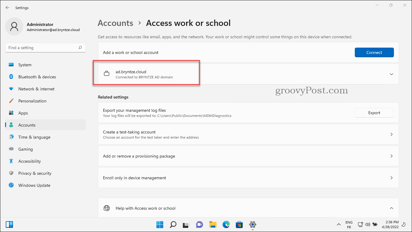- После того, как вы вошли в систему, мы можем перейти к Настройки > Учетные записи > Доступ к работе или учебе еще раз и убедитесь, что наш домен отображается.
