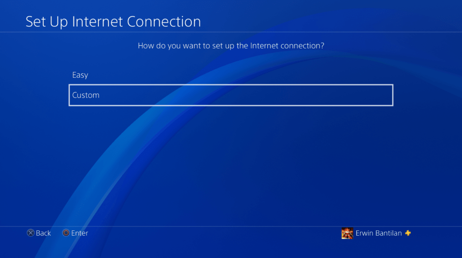 Then you’ll be asked how you set up your internet connection. You need to select Custom.