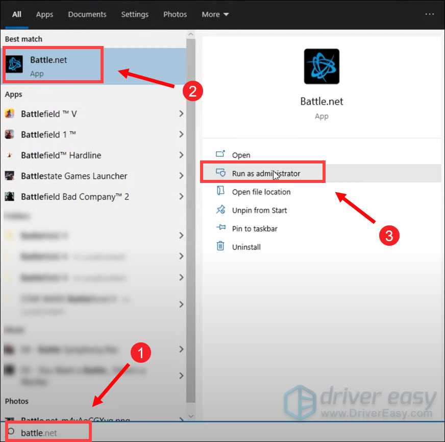 2) On your keyboard, press the Windows logo key to open up the Start menu. Then type in battle. From the results, find the app Battle.net. Then click Run as administrator.