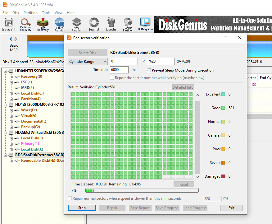 DiskGenius marks sectors conditions with colored blocks and bad sectors are tagged with red block (Damaged). If the disk has bad sectors, you can try repairing them after the scanning completed. Note: You should make sure all files on the disk have been backed up before repairing bad sectors.