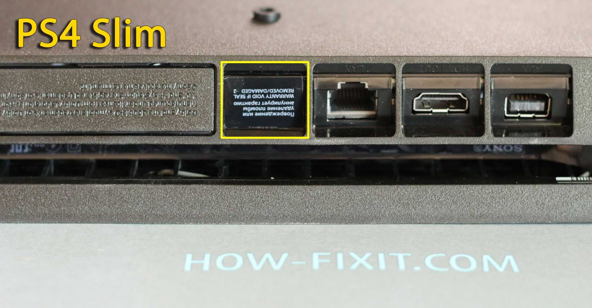 На версии PS4 Slim гарантийная пломба находится с задней стороны консоли, возле LAN порта. В отличии от первой ревизии консоли, на корпусе PS4 Slim всего одна гарантийная пломба.