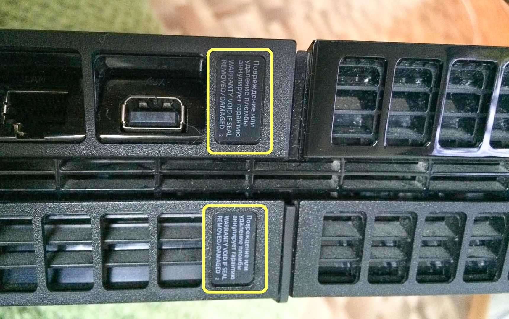 PS4 первой версии гарантийные пломбы находятся с задней стороны консоли, где расположены порты подключения.