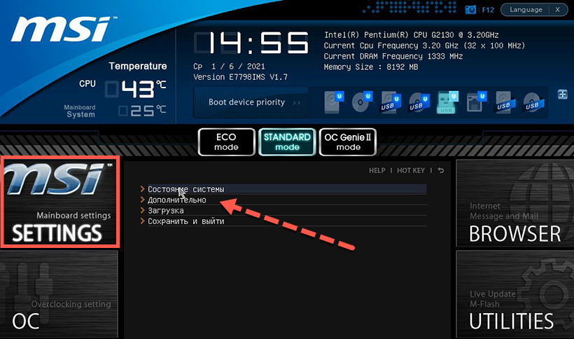 - В случае с UEFI материнской платы от MSI это раздел «Mainboard Settings»;