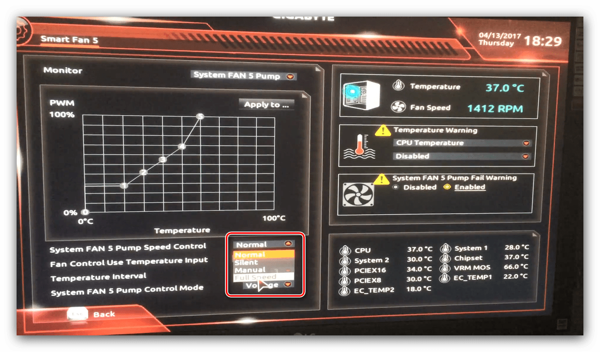 Можно также настроить режим работы кулера вручную (вариант «Manual») или выбрать минимально шумный, но обеспечивающий наихудшее охлаждение (параметр «Silent»).