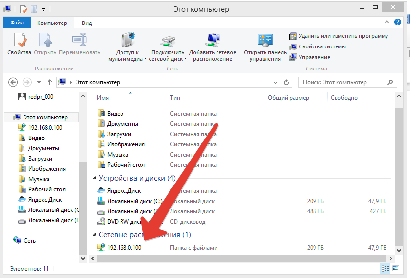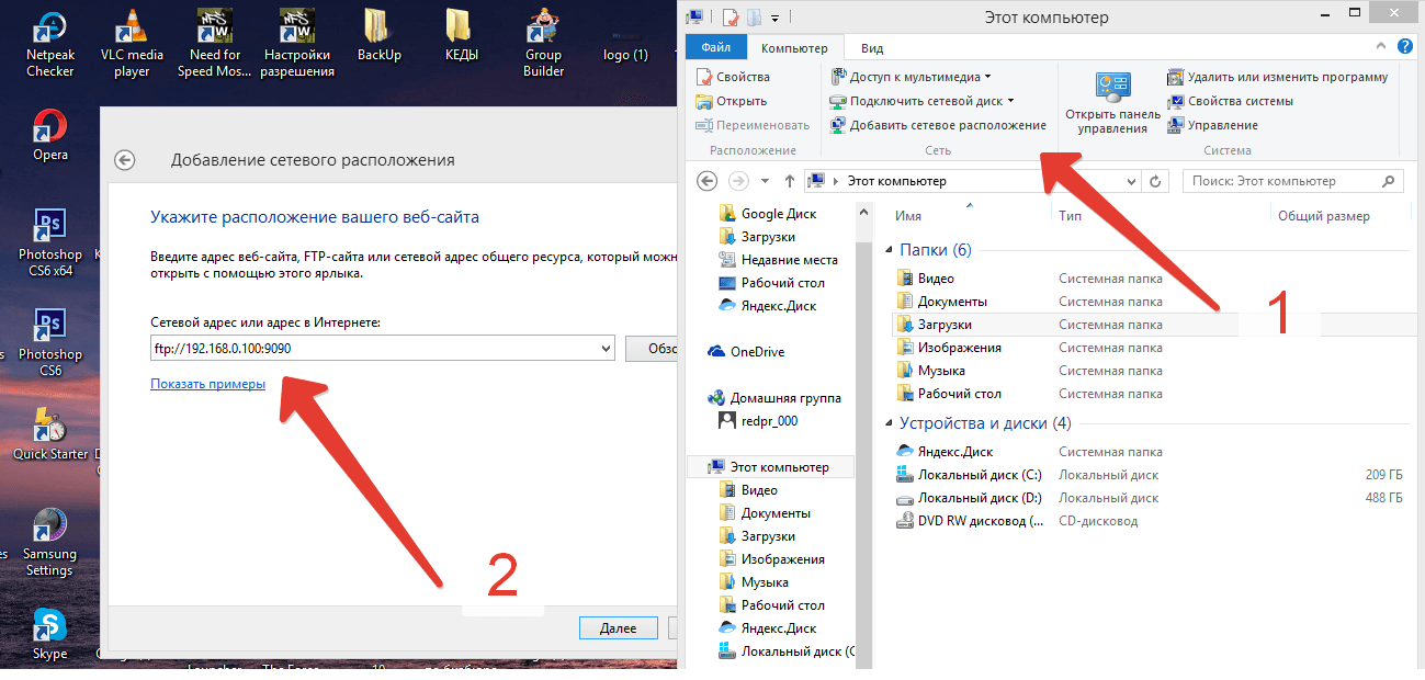 На последнем шаге, после нажатия кнопки «Готово», должно появиться новое окно в котором нужно ввести логин и пароль, вводим те, что указывали в приложении на смартфоне — все готово. Теперь у нас в «Моем компьютере» появился дополнительный элемент «Сетевые расположения» с папкой. Переходим в эту папку и попадаем в подключенный телефон.