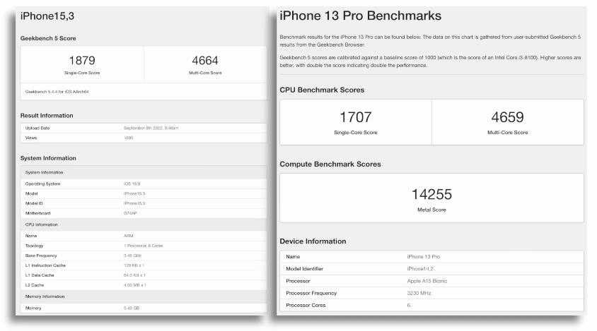 Появились результаты синтетики в Geekbench 5. Результаты производительности, что в одноядерном, что в многоядерном режимах между iPhone 14 Pro и iPhone 13 Pro оказались незначительными. Нужно делать реальные тесты.