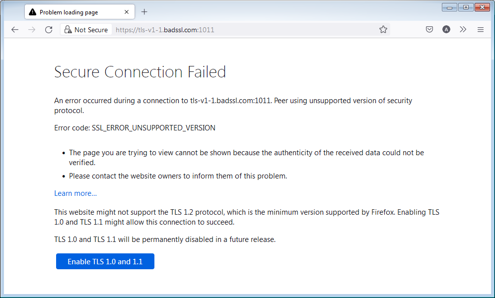 Начиная с Firefox версии 78, минимальная версия TLS, разрешённая по умолчанию — TLS 1.2. Веб-сайты, которые не поддерживают TLS версии 1.2 или выше, вызовут отображение страницы с ошибкой «Ошибка безопасного соединения» с кодом ошибки «SSL_ERROR_UNSUPPORTED_VERSION» и сообщением «Этот веб-сайт может не поддерживать протокол TLS 1.2 — минимальную версию, поддерживаемую Firefox». Для получения дополнительной информации прочтите этот пост в блоге Mozilla.