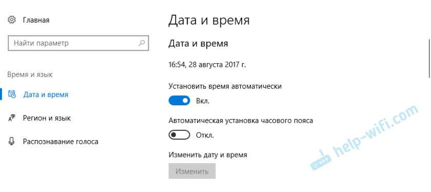 Вот так выглядит меню настройки даты и времени в Windows 10: