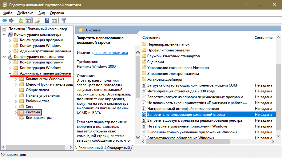 Откроется редактор локальной групповой политики. Перейдите к разделу Конфигурация пользователя — Административные шаблоны — Система