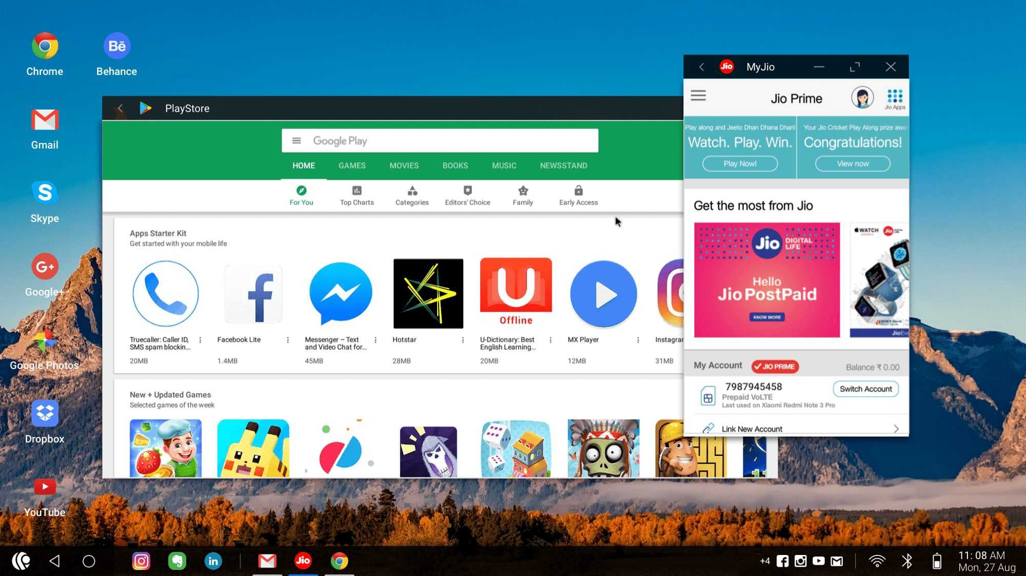 Обеспечивает удобство рабочего стола с меню «Пуск», панелью задач и т. Д. Он имеет многооконную поддержку с опциями для максимизации, минимизации, закрытия и изменения размера окна. Возможность отключить многооконный режим для любого приложения, если вам это нужно. Включает основные сочетания клавиш, такие как Alt + Tab, Alt + F4, Win + D и т. Д. Близко к опыту AOSP с только необходимыми функциями рабочего стола. На панели задач есть возможность закреплять приложения, отображать уведомления и системные значки. Существует инструмент сопоставления клавиш Decapro для игр с клавиатурой и мышью (нажмите F12). PrimeOS предварительно отображает некоторые популярные игры, такие как PUBG, Subway surf и т. Д. У него есть инструменты графического процессора для подделки информации графического процессора для любой игры.