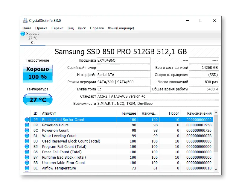 Подробнее о проверке SSD на наличие ошибок и об атрибутах SMART в CrystalDiskInfo читайте в отдельной статье: Как проверить состояние SSD.