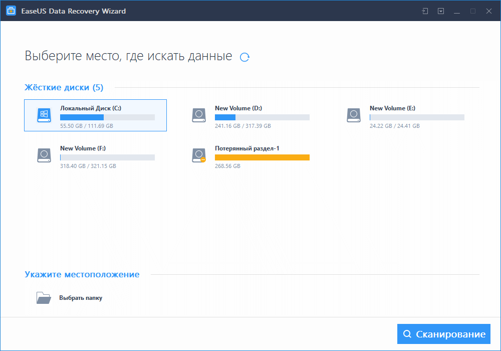 Шаг 1. Укажите расположение: это локальный жесткий диск или съемное запоминающее устройство, с которого были удалены файлы? Выберите точное расположение файла и нажмите кнопку «Сканировать».