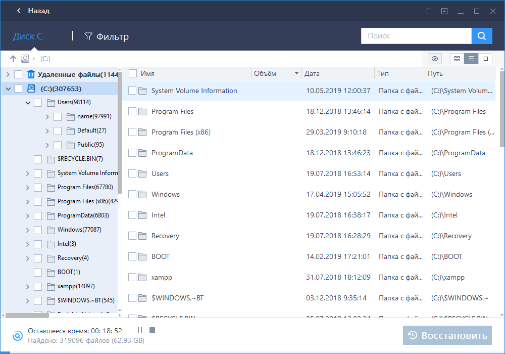 - Предоставляет возможность восстановления удаленных и потерянной информации.