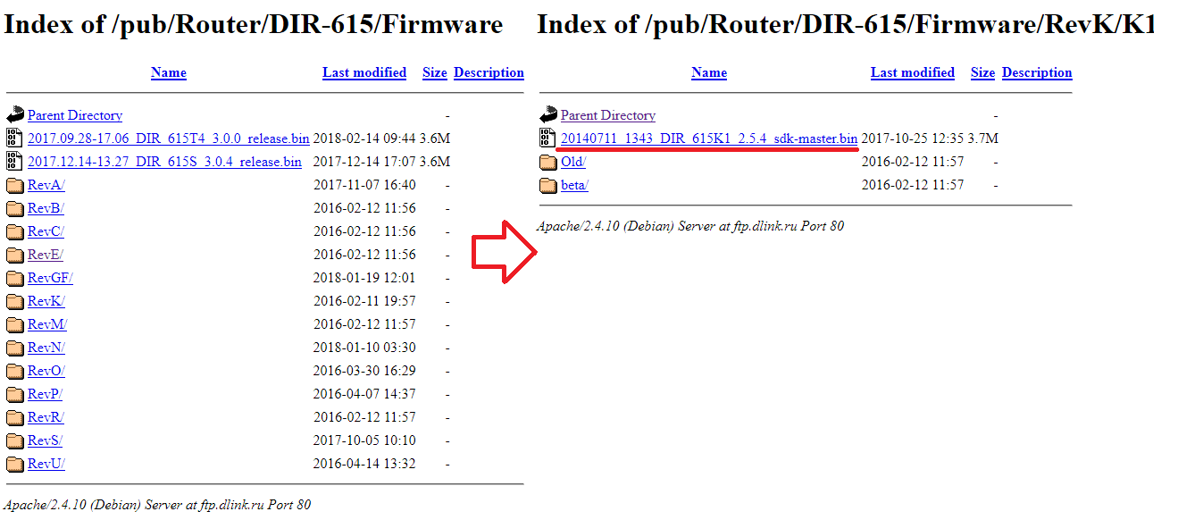 Здесь мы видим папки с разными ревизиями прошивок, выпущенных для модели роутера DIR-615. Выбираем ту, которую мы определили по наклейке или через web-интерфейс: в моем случае это ревизия Е4.Заходим в папку «RevE».