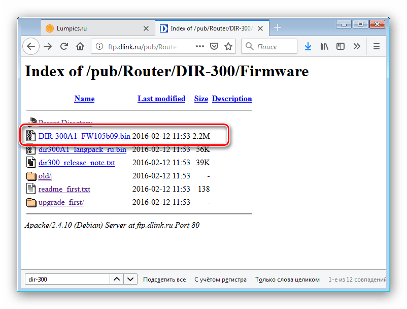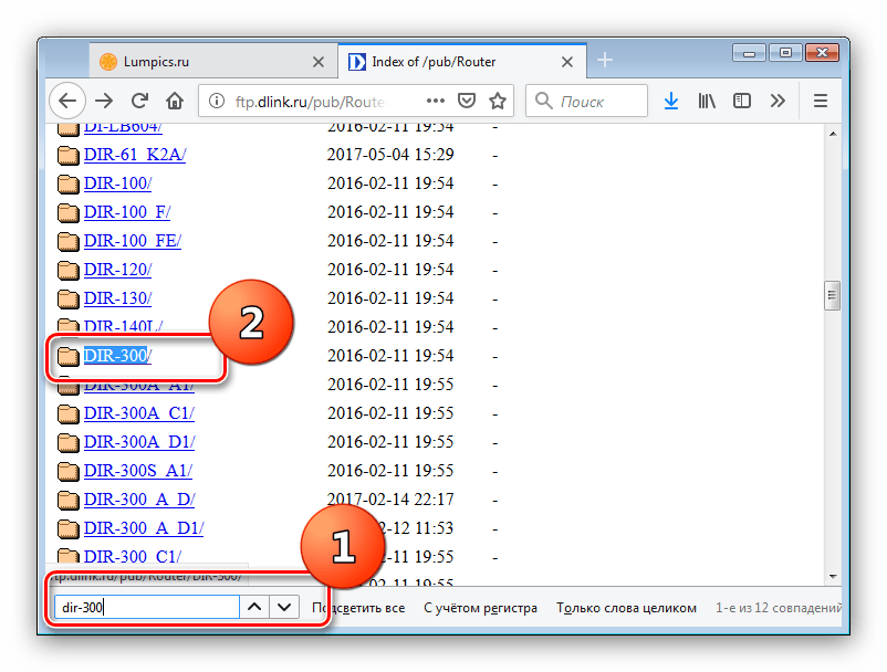 Переходите на FTP-сервер загрузок производителя и найдите папку с файлами к вашему устройству. Для удобства можете нажать Ctrl + F, ввести в поисковой строке dir-300.