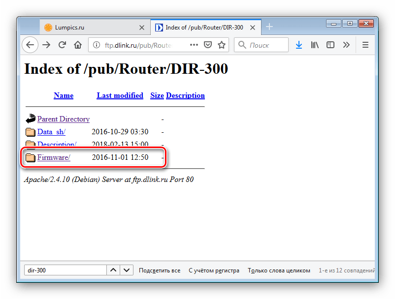 Переходите по этой ссылке на FTP-сервер загрузок производителя и найдите папку с файлами к вашему устройству. Для удобства можете нажать Ctrl + F, ввести в поисковой строке dir-300 .