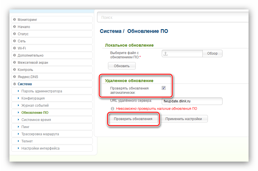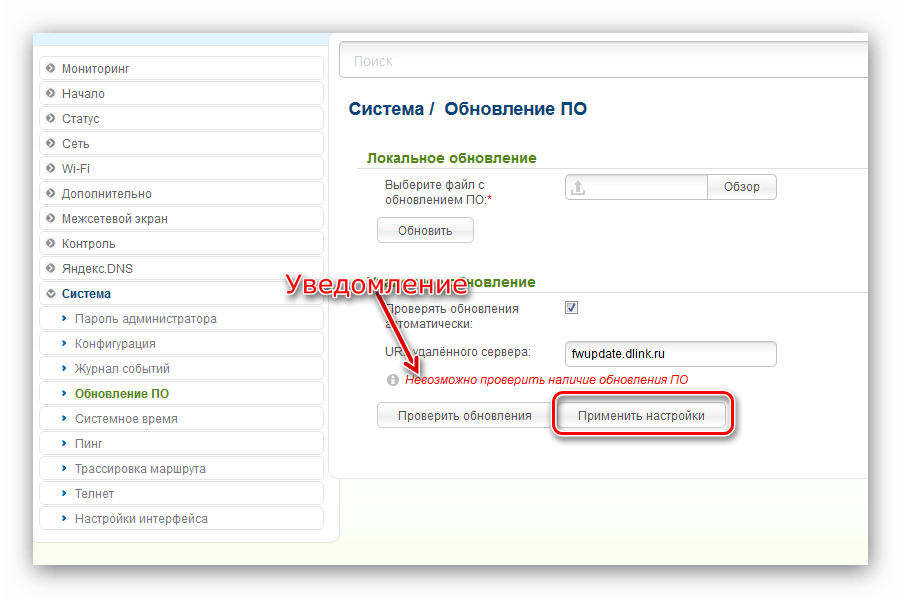 Если обновления прошивки будут обнаружены, то вы получите уведомление под строкой адреса сервера апдейтов. В таком случае станет активной кнопка «Применить настройки» — нажмите её для начала обновления.
