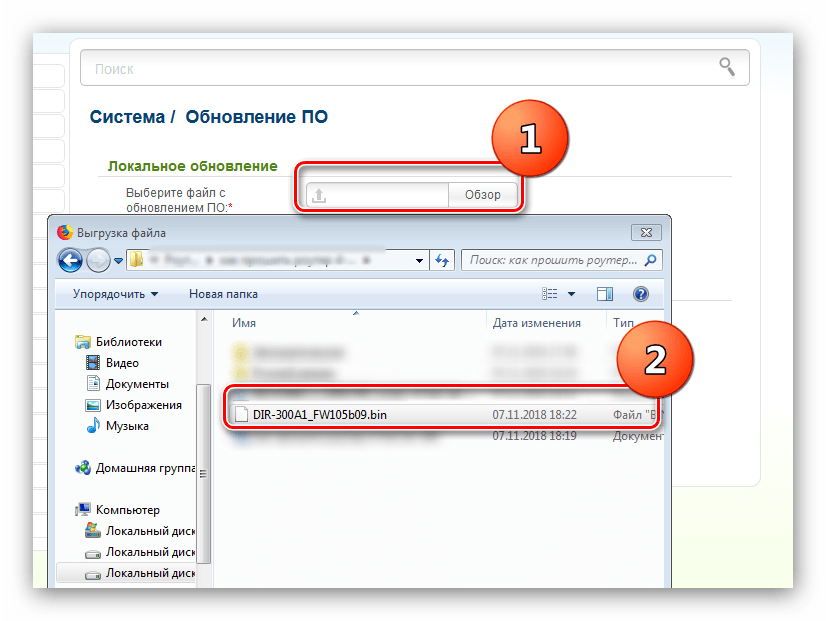 Откройте раздел обновления Firmware (шаг 1 предыдущего способа) и обратите внимание на блок «Локальное обновление».Первым делом нужно выбрать файл прошивки – нажмите на кнопку «Обзор» и через «Проводник» перейдите в директорию со скачанным ранее BIN-файлом.