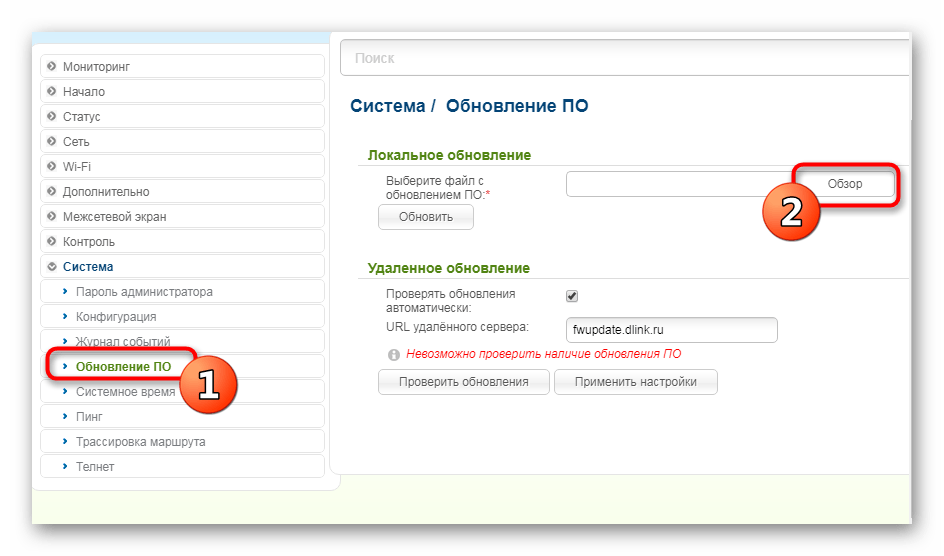 Перейдите в меню обновления ПО так, как это было показано в первом способе. Для выбора файла прошивки щелкните на «Обзор».