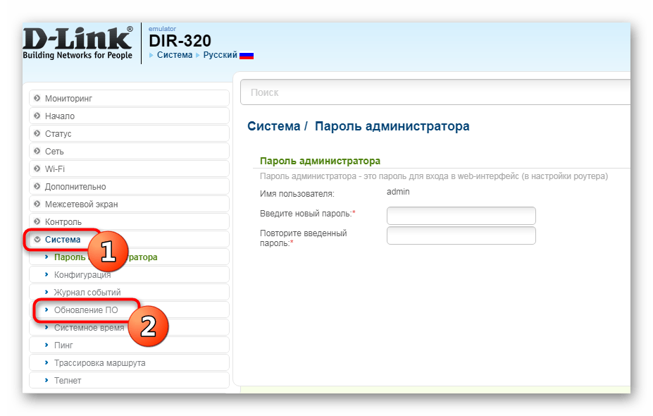 Для выполнения обновления открываем обозреватель интернета и следуем по адресу: 192.168.0.1. Откроется страница авторизации. Логин и пароль по умолчанию DIR 320 имеет admin. Переходим в раздел системных настроек с главного меню или через пункт ручной конфигурации и выбираем пункт «Обновление ПО». В открывшейся вкладке указываем ранее загруженный файл с прошивкой.