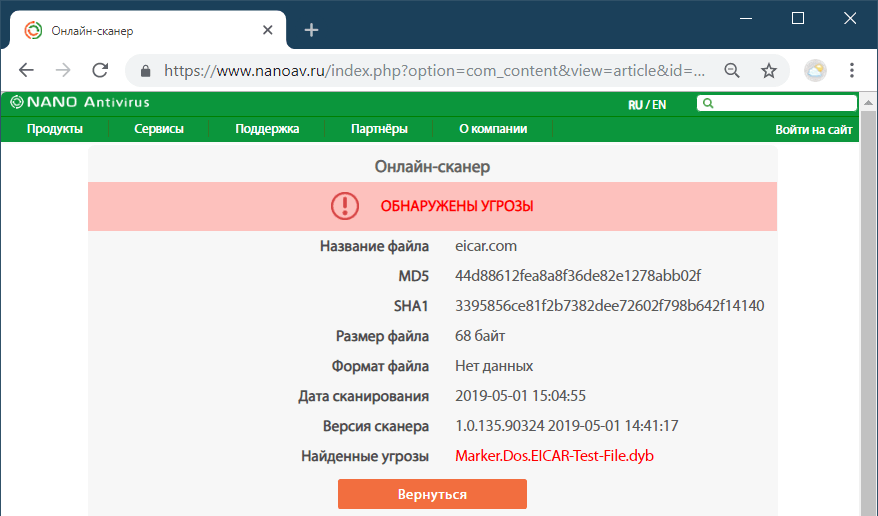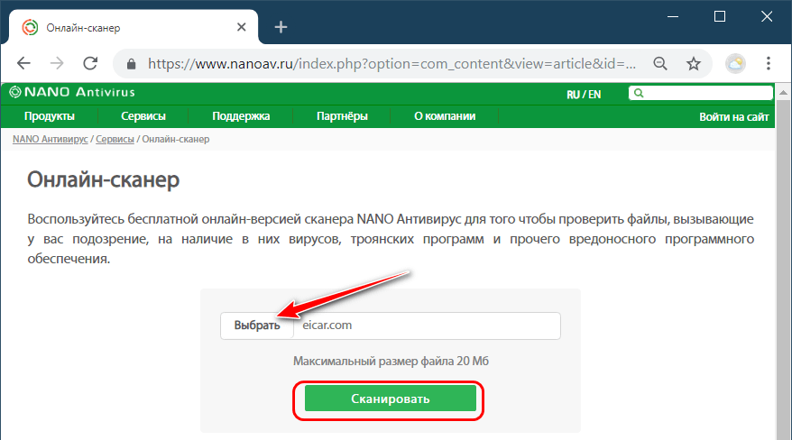Сервис VirScan.org предлагает онлайн-проверку на предмет наличия угроз только файлов. Сотрудничает с 45-ю антивирусными движками, в числе которых – Лаборатория Касперского, Avira, Eset, Doctor Web, Panda Security, Nano Antivirus. Лимит по весу – 20 Мб.