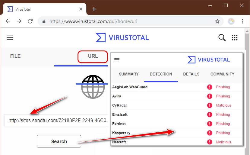 VirusTotal предлагает проверку ссылок на предмет их принадлежности к фишинговым сайтам. Вставляем ссылку в поле во второй вкладке сервиса «URL» и жмём «Search». Получаем результат.