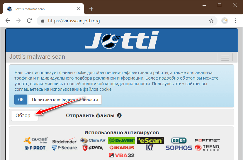 Для загрузки файла на сайт сервиса жмём кнопку «Обзор».