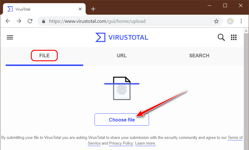 Заходим на сайт VirusTotal, на главной вкладке «File» загружаем на сервер файл.
