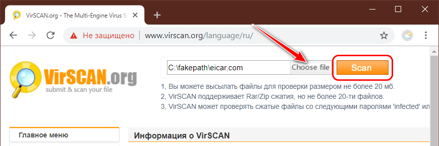 Загружаем файл на сервер с помощью кнопки «Choose file», жмём «Scan».