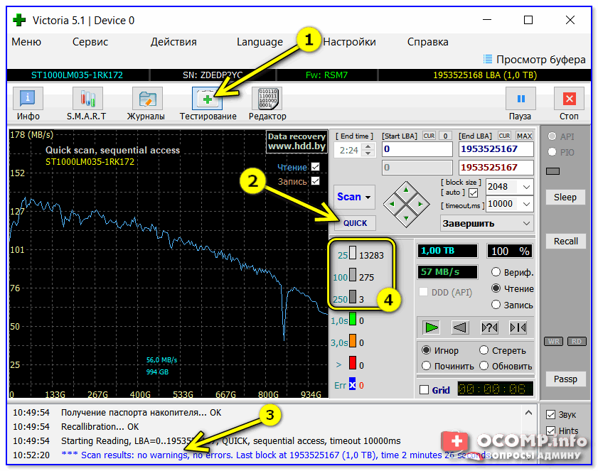 Загрузившись с нее — необходимо открыть программу Victoria и проверить диск (оценить его состояние — не начал ли он сыпаться (из-за этого, кстати, «часть» диска могла перестать читаться и, как следствие, ошибка «A disk read error occurred»)).