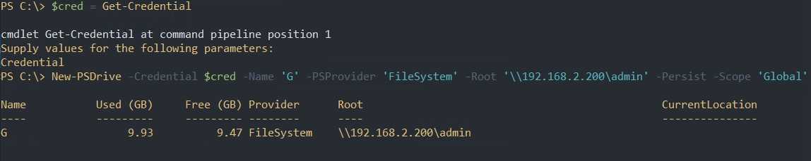 В случае команды ‘New-PSDrive’ вам нужно будет выполнить ‘Get-Credential’ и поместить в него учетные данные. Традиционный способ поместить эти данные в переменную: