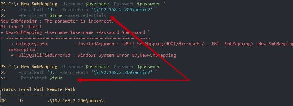 Проблема, которую не получилось решить на разных версиях Powershell, связана с параметром ‘-SaveCredentials’. Его указание приводит к ошибке «New-SmbMapping : The parameter is incorrect.». Его отсутствие — не сохраняет введенные учетные данные и после перезагрузки связь с диском может пропасть если не добавить соответствующую запись в ‘Credential Manager’.
