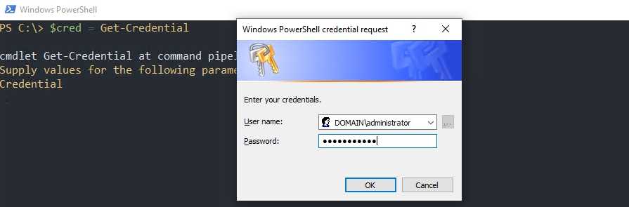 После этого мы передаем переменную в параметр ‘-Credential’: