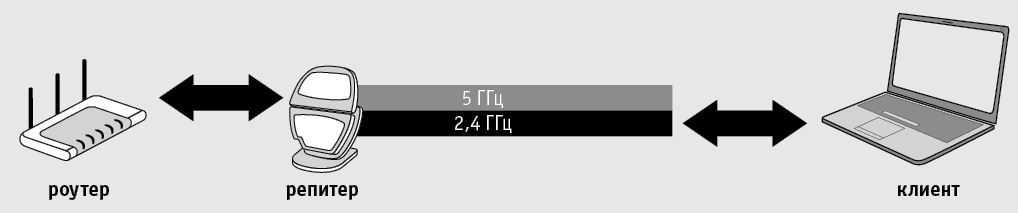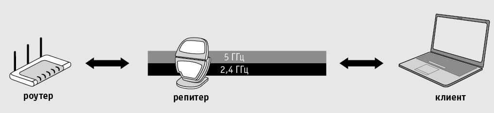 Ретрансляция Crossband: репитер взаимодействует с роутером на одном диа- пазоне, а с клиентом — на другом. Это обеспечивает полноценную скорость